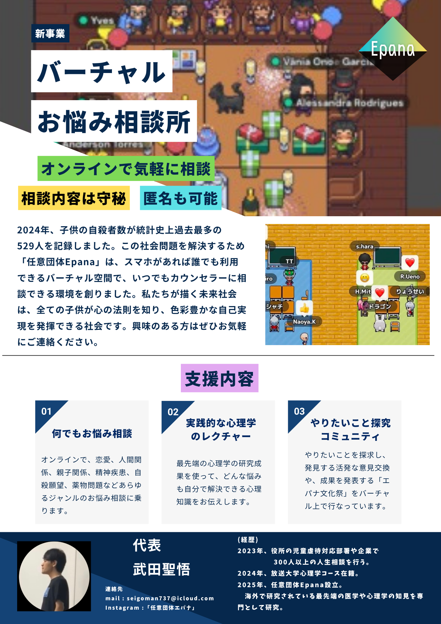 任意団体Epana(拠点:京都府山科区/代表:武田聖悟)は、2025年11月8日、バーチャルお悩み相談所を開設致しました。 2024年、子供の自死者数は過去最高の529人となりました。この社会問題を解決すべく、子ども1人に対して、1人の相談員を配置する「1チャイルド、1カウンセラー」を日本社会に実装していきます。 そのための場所として、バーチャルアバターを使って、オンライン上でいつでもお悩み相談の対応をする「バーチャルお悩み相談所を設立致しました。 日本にいる全ての子供達を一人も漏らさないように、心理支援を行なっていきます。利用されたい方や、興味のある方がいましたらお気軽にご連絡ください。